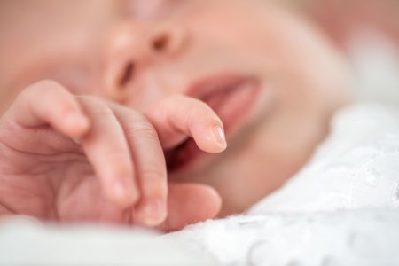 Mouth detail of a baby girl in christening dress