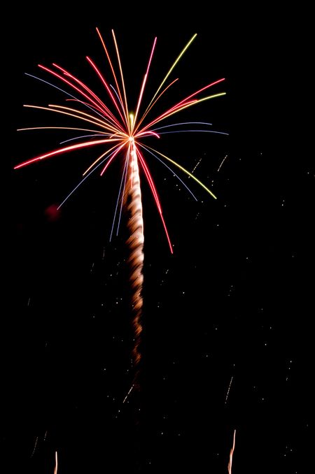Multicolored burst of fireworks with feathery rocket trail and sparks from previous explosion