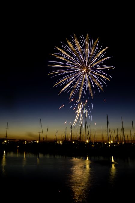 Multicolored burst of fireworks over marina in Michigan City, Indiana, USA