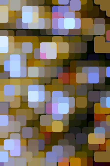 Multicolored geometric abstract illustration of many rounded squares arrayed like so many city lights on a grid with a dark background, for themes of urban density, variety and diversity