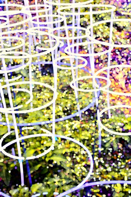 Multicolored nocturnal abstract of wire support rings, glowing in mid air like so many halos, for growth of tomatoes and other plants in spring garden