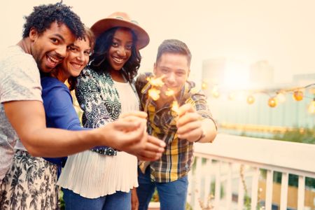 Multi-ethnic millenial group of friendsfolding sparklers on rooftop terrasse at sunset