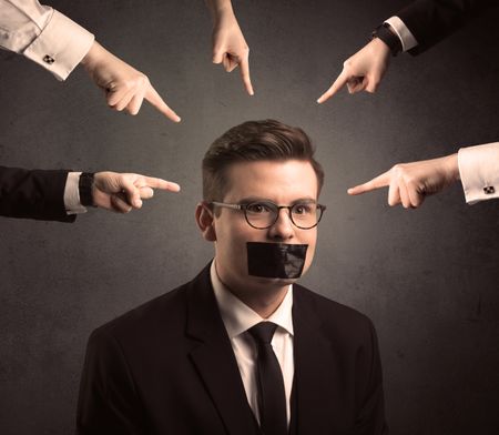 Multiple caucasian hands pointing at business male employee