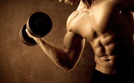 Muscular fit bodybuilder athlete lifting weight on grungy background