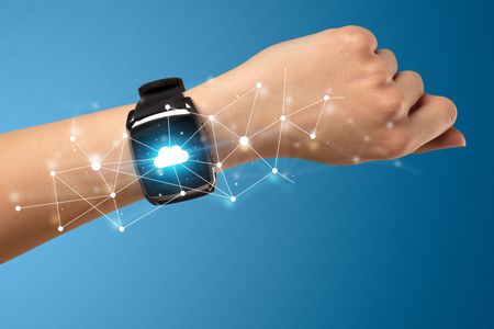 Naked female hand with smartwatch and with cloud technology and connection symbol
