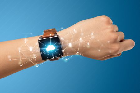 Naked female hand with smartwatch and with cloud technology and connection symbol