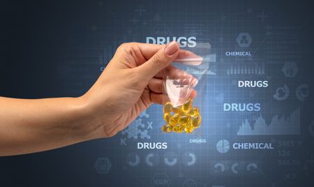 Naked hand gives chemicals in vacuum plastic bag with scholarly concept