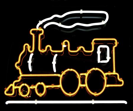Neon sign of old-fashioned steam-powered locomotive and smoke in store window