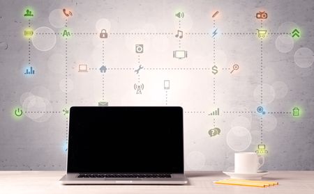 Notebook with blank screen sitting on office desk in front of background wall full of communication icons and illustrated connections concept