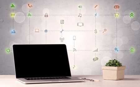 Notebook with blank screen sitting on office desk in front of background wall full of communication icons and illustrated connections concept