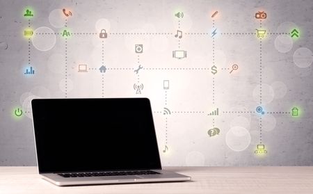 Notebook with blank screen sitting on office desk in front of background wall full of communication icons and illustrated connections concept