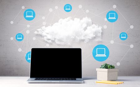 An office desk with laptop, flower, coffee, mobile phone and illustration in the background of connected computers around big white cloud