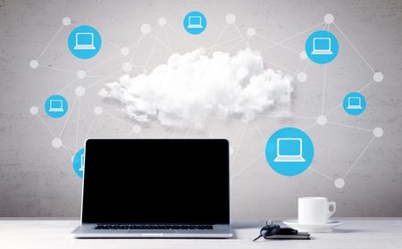 An office desk with laptop, flower, coffee, mobile phone and illustration in the background of connected computers around big white cloud
