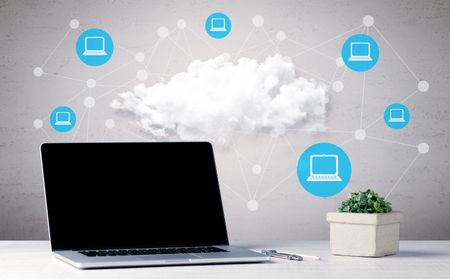 An office desk with laptop, flower, coffee, mobile phone and illustration in the background of connected computers around big white cloud
