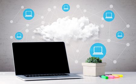 An office desk with laptop, flower, coffee, mobile phone and illustration in the background of connected computers around big white cloud