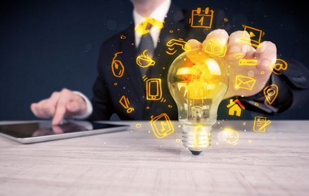An office salesman promoting his bright ideas concept with illustration of online media and device logos around electric glass light bulb.