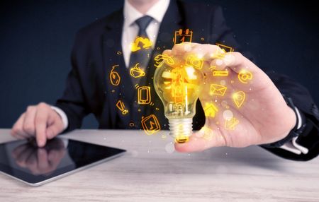 An office salesman promoting his bright ideas concept with illustration of online media and device logos around electric glass light bulb.