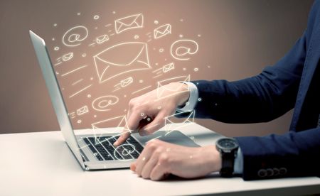 An office worker sending emails and communication with clients with the help of a portable laptop on desk concept