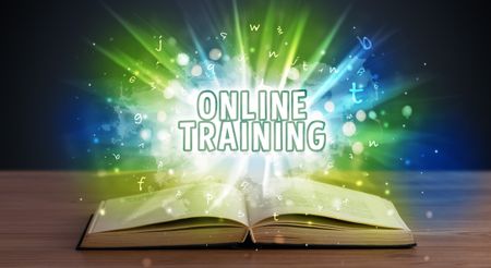 ONLINE TRAINING inscription coming out from an open book, educational concept