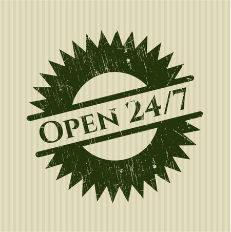 Open 24/7 rubber stamp with grunge texture