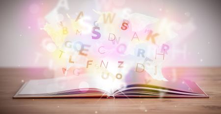 Open book with glowing letters on concrete background. Colorful education concept