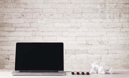An open laptop on an office desk with flower, coffee, books in front of white brick wall background concept