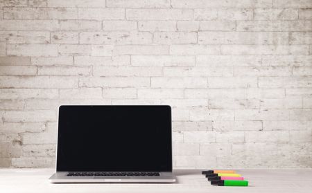 An open laptop on an office desk with flower, coffee, books in front of white brick wall background concept