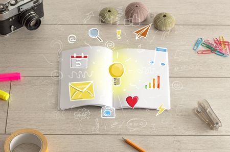 Open notebook on the floor with instruments nearby and icons symbols on it