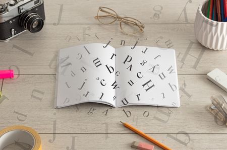 Open notebook on the floor with office instruments nearby and letters on it