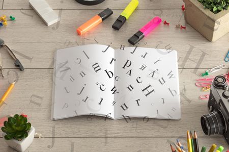 Open notebook on the floor with office instruments nearby and letters on it