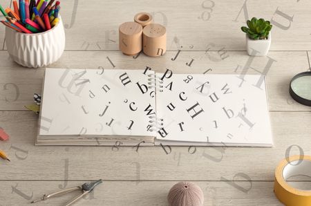 Open notebook on the floor with office instruments nearby and letters on it