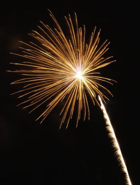 Orange burst of fireworks with white-hot core and feathery white rocket trail