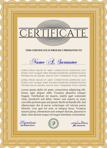Orange Certificate template or diploma template. Complex background. Vector pattern that is used in currency and diplomas.Superior design.