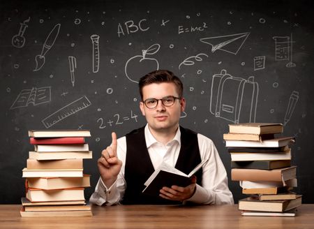 A passionate young teacher sitting at school desk with pile of books in front of blackboard drawn full of back to school items concept.
