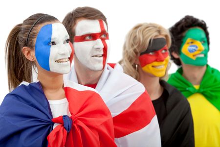 Patriotic group of people from different countries and flags painted on their faces - isolated