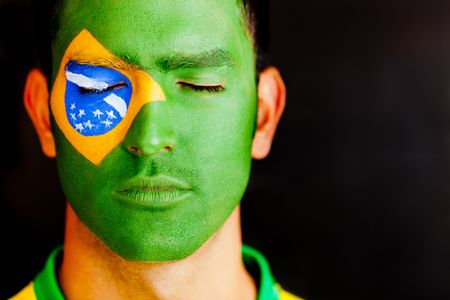 Patriotic man from Brazil with flag painted on his face and eyes closed