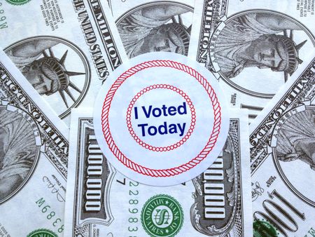 It pays to vote: Proclamatory sticker on a pile of fake million-dollar bills (play money)