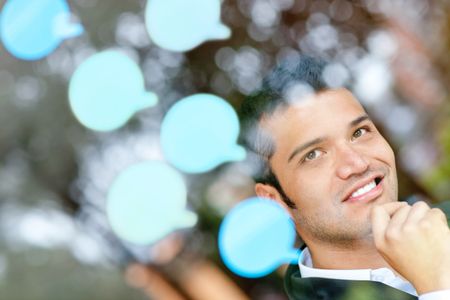 Pensive business man with thought bubbles around his head