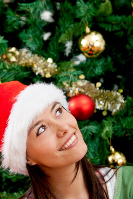 Pensive Christmas woman portrait with a Santa hat