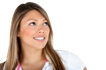 Pensive female looking up - isolated over a white background