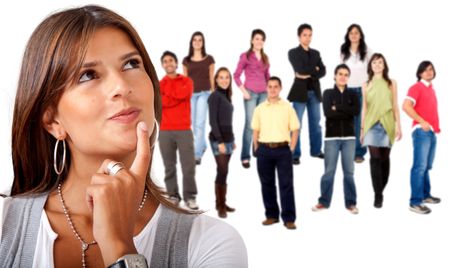 pensive girl in front of a group isolated over a white background
