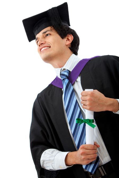 Pensive graduation man isolated over a white background