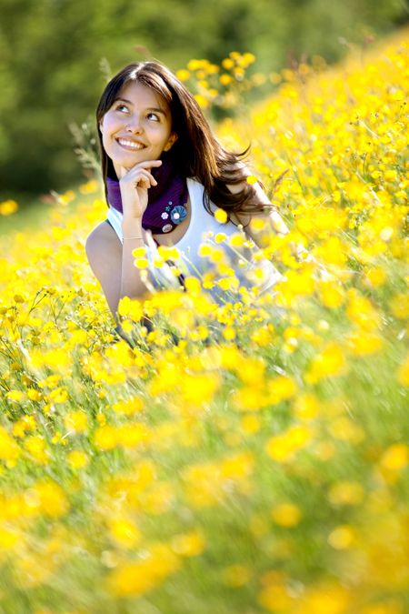 Pensive woman sitting on a beautiful meadow