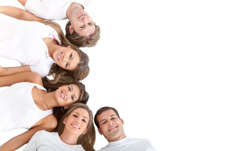 People lying on the floor making a semi-circle and wearing white clothes ? isolated