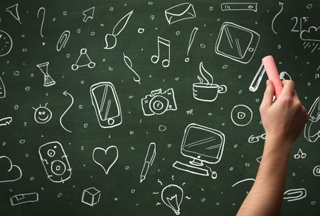 A person drawing media and communication icons on school blackboard with chalk