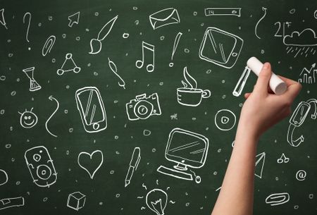 A person drawing media and communication icons on school blackboard with chalk