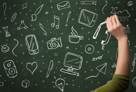 A person drawing media and communication icons on school blackboard with chalk