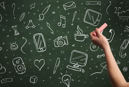 A person drawing media and communication icons on school blackboard with chalk