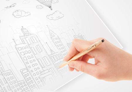 A person drawing sketch of a city with balloons and clouds on a plain paper