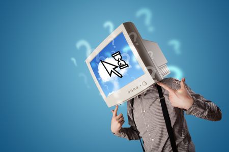 Person with a monitor head and cloud based technology on the screen, blue background